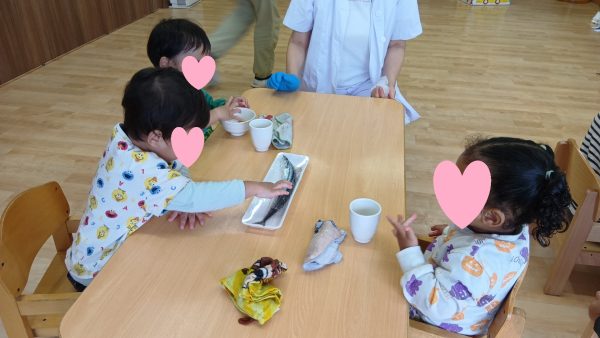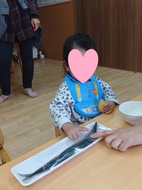 🐟秋と言えば食欲の秋!食育でサンマを触ってみたよ🐟             給食室の先生が、サンマのお話をたくさんしてくれました。そしてお昼の給食でサンマを食べました。