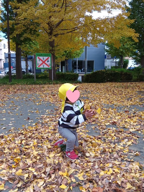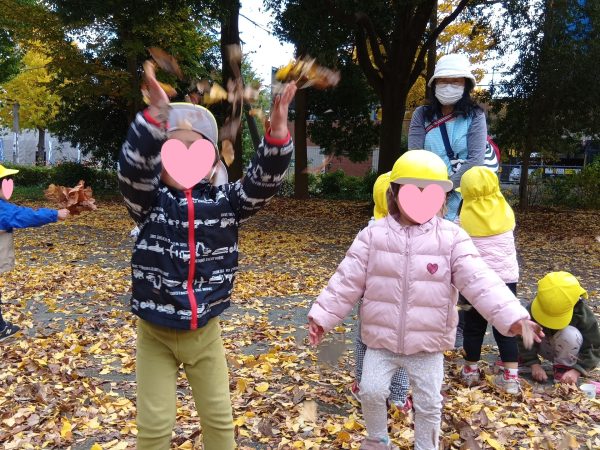ぼくも負けないで落ち葉を投げるよ~(たいよう)