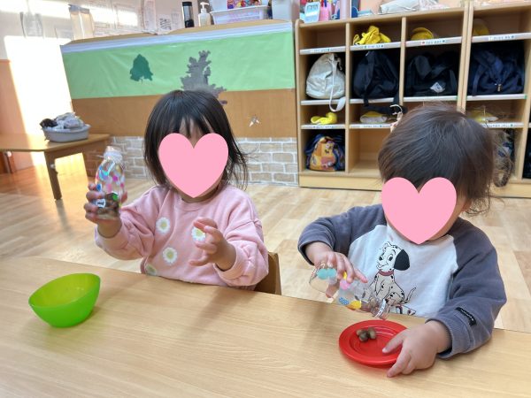 公園で拾ってきたどんぐりでマラカスを作ってるよ!(つち)