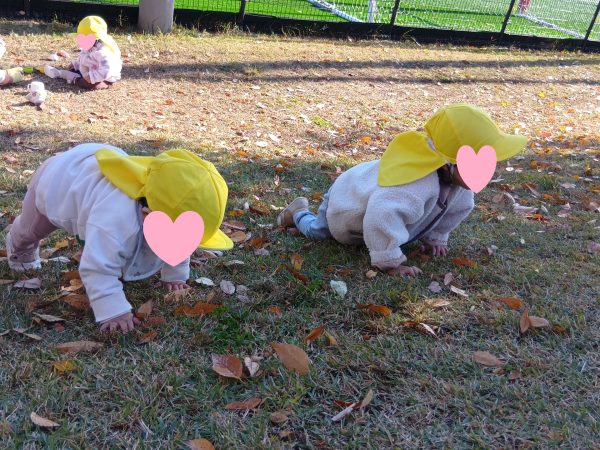 落ち葉を見たり、芝生の斜面をハイハイで登るよ!(いずみ)